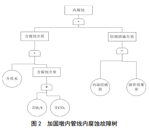 加固墩內管線(xiàn)內腐蝕故障樹(shù)如圖 2所示。內腐蝕受含腐蝕介質(zhì)和防腐措施失效共同影響。天然氣屬干氣輸送,即使含有CO2、 H2S等腐蝕性成分,沒(méi)有水的存在,腐蝕就難以發(fā)生。因此,內腐蝕風(fēng)險相對較低,控制措施應從監控脫水效果和內檢測監控著(zhù)手。
