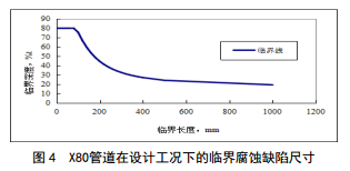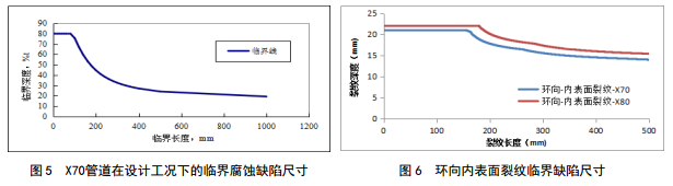加固墩處管線(xiàn)管體腐蝕缺陷臨界尺寸和環(huán)向內表面裂紋缺陷臨界尺寸,分別按ASME B31G―2012―3770和API 579計算,如圖 4、圖 5、圖 6所示。在下次內檢測過(guò)程中,發(fā)現存在腐蝕型缺陷和環(huán)向裂紋缺陷,可按照圖 4~6給出的腐蝕缺陷臨界尺寸和環(huán)向裂紋缺陷臨界尺寸判斷是否可接受。當評估點(diǎn)坐標落在曲線(xiàn)下方時(shí),缺陷可以接受;評估點(diǎn)位于曲線(xiàn)上方 時(shí)缺陷不能接受。由此可判斷可能出現的缺陷是否處于可接受范圍內。