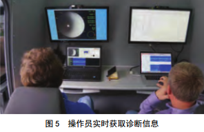 掃 描 探 傷 儀 的 內 置 式 鋰 — 鐵 聚 合 物 蓄 電 池(200 W/h容量)可提供長(cháng)達8 h的自給式操作電力(最高行駛速度空載模式下5 m/min,檢測模式下0.3~0.7 m/min)。操作員(距離插入掃描探傷儀的位置最遠為 1 500 m)通過(guò)Wi-Fi網(wǎng)絡(luò )實(shí)時(shí)控制掃描探傷儀移動(dòng),并實(shí)時(shí)獲取診斷信息,如圖 5所示。