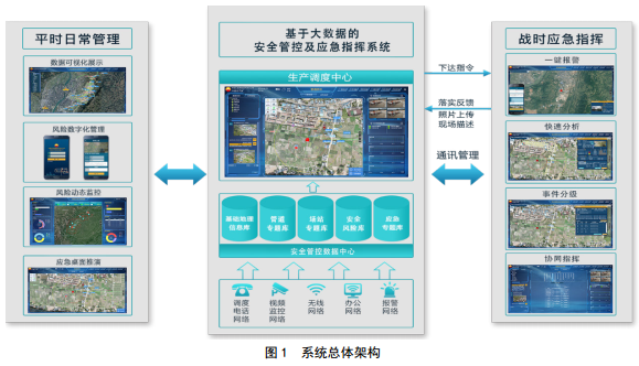 管道空間安全系統總體框架見(jiàn)圖 1,平時(shí)日常管理,實(shí)現數據可視化展示、風(fēng)險數字化管理、風(fēng)險動(dòng)態(tài)監控及應急桌面推演等功能;戰時(shí)應急指揮,實(shí)現APP一鍵報警、快速分析、事件分級、協(xié)同指揮等。