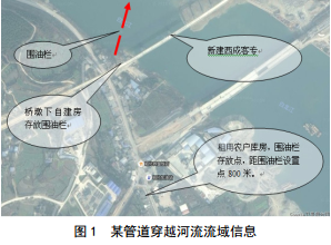 管道水域高后果區是管道應急防控的重點(diǎn)區域。為此組織站場(chǎng)認真勘察穿越河流,梳理相關(guān)信息,建立了管道穿越流域信息數據庫。主要信息包括穿越地點(diǎn)、河流名稱(chēng)、河流寬度、河流走向、分季節流速和水位等。據此確定每處穿越點(diǎn)溢油回收位置、圍油欄敷設點(diǎn)、應急物資儲備點(diǎn),并將其位置信息制成圖集,如圖 1所示。