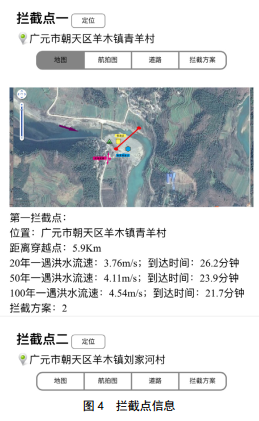 公司編制了一款方便快捷軟件,內置信息包括兩閥室之間管段泄油量;下游攔截點(diǎn)位置和攔油方案;人員、物資、設備情況;道路交通情況;下游環(huán)境敏感區位置和距離; 根據20年、 50年、 100年一遇洪水流速計算得出各個(gè)攔截點(diǎn)、敏感區、匯入口的流經(jīng)時(shí)間。如圖 3所示。