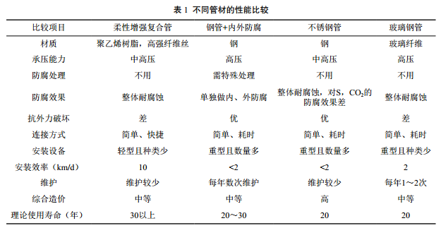 (1)管道材質(zhì)選擇。目前在用的管材類(lèi)型有金屬管+內外防腐、不銹鋼及非金屬管,不同管材的性能比較見(jiàn)表 1。