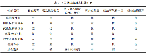 (2)外防腐及陰極保護選擇。調研分析6種防腐形式,性能對比見(jiàn)表 2。