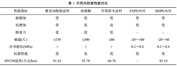 (3)內防腐選擇。不同內防腐特性對比見(jiàn)表 3。