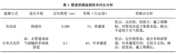 管線(xiàn)首末端處均設置電動(dòng)快速切斷閥,可實(shí)現遠程關(guān)斷。輸油管道泄漏監測技術(shù)與快速切斷閥聯(lián)動(dòng),為快速定位、緊急關(guān)斷和應急搶修提供自控手段。目前常用的分布式光纖監測技術(shù)和負壓波監測技術(shù)見(jiàn)表 4。