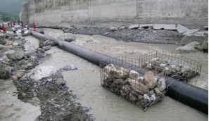河(溝)道水毀的防治措施包括: 對水流沖刷暴露的管道可采用石籠或鋼管樁等臨時(shí)穩管加固;對順河床段和穿越河流段因水流沖刷已經(jīng)暴露的管道應采用漿砌石或混凝土過(guò)水面進(jìn)行管道防護;對水流持續沖刷下切的穿越河段,可在下游修筑谷坊、漿砌石或混凝土地下防沖墻等進(jìn)行防護,同時(shí)應采用擋墻、護岸等措施護岸。如果溝道沖刷物中裹挾有較大的石塊,還應采取一些防撞擊措施,如管道外包砼或漿砌石護底等。
