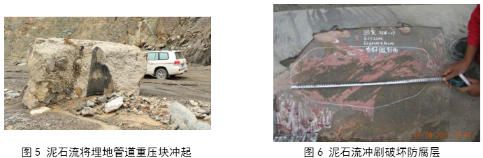 新疆庫米什山谷地區,沿山谷敷設的管道和壓重塊都被泥石流巨大的推浮力推浮到地表,造成防腐層破壞及形成管道表面缺陷(圖 5、圖 6)。