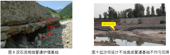 當管道和泥石流“伴行”時(shí),要考慮泥石流的側向侵蝕,因為泥石流沿彎曲溝道運動(dòng)時(shí)速度快、慣性大,在彎道凹岸處有顯著(zhù)的彎道超高現象。行進(jìn)中的泥石流若突然受陡壁阻擋,會(huì )在凹岸底部產(chǎn) 生強大的環(huán)流,對凹岸產(chǎn)生極大的破壞力(圖 8),攔沙壩設計不當造成管道基礎不均勻沉降(圖 9),所以,泥石流排導溝槽要增加防掏蝕和沖擊的措施。