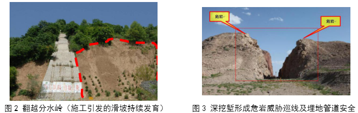 正確的選定線(xiàn)是管道減災防災工作的基礎,既決定了管道的建設和運營(yíng)成本,也決定了未來(lái)管道減災防災工作量。復雜地質(zhì)條件下,越嶺選線(xiàn)和河谷選線(xiàn)十分關(guān)鍵,其好壞基本決定了線(xiàn)路的優(yōu)劣,是整個(gè)線(xiàn)路的關(guān)鍵控制性工程。越嶺位置要盡量避開(kāi)地質(zhì)災害或地質(zhì)災害隱患點(diǎn),大型山嶺的穿越要綜合考慮宏觀(guān)地質(zhì)構造和局部地質(zhì)條件,在盡量繞避或者大角度穿越高地震斷裂帶、地形激變帶時(shí),盡量避開(kāi)大型滑坡和滑坡連續分布地段,巖層順傾地段和厚層堆積層地段,避免施工開(kāi)挖造成新的滑坡和危巖崩塌(圖 2、圖 3)。