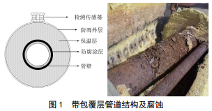 為了防腐和保溫,管道本體大都包裹在防腐層或保溫層等之下,這給常規檢測帶來(lái)了較大的困難(見(jiàn)圖 1)。檢測傳感器距離管道本體的距離稱(chēng)為提離高度,受距離影響在高提離高度下的電磁響應信號極其微弱、背景噪聲大。