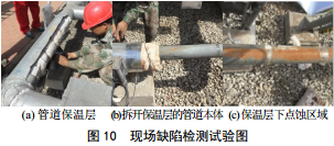 傳感器距離管道本體表面約為50 mm,測試速度為1 m/s,測試信號如圖 9所示。圖 9中存在三處疑似缺陷信號,如圖中標注。然后進(jìn)行多次測試,信號基本保持穩定。為驗證信號準確性,對包覆層進(jìn)行剝離,如圖 10所示。剝離最外層白鐵皮,發(fā)現白鐵皮下存在固定保溫棉的細鐵絲,鐵絲間距約20 cm,與測試中的疑似缺陷信號對應。進(jìn)一步剝離保溫層,管 道外表面存在輕微點(diǎn)蝕。