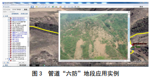 (1)“六防”區域管理。確定六防區域位置,收集典型照片,進(jìn)行現狀描述。某管道滑坡段位于延安市志丹縣雙河鄉墩梁村,屬濕陷性黃土V字型陡坡地段,通過(guò)該系統,可對管線(xiàn)所經(jīng)區域地形地貌、高度落差、周邊道路情況、泄漏流向、圍堵點(diǎn)選擇等進(jìn)行鳥(niǎo)瞰瀏覽(圖 3)。