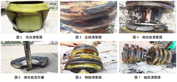 根據內檢測計劃,2017年9月5日至2018年8月8日,先后對該管段發(fā)送泡沫、皮碗、測徑板、鋼刷、磁鐵清管器各一次及模擬體兩次,均順利收球(圖 2-7),清出污物較多(鐵條13根),但清管器密封板均有劃痕,測徑板均出現變形。