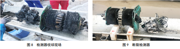 2018年9月21日08:10發(fā)送漏磁檢測器,9月21日16:15監聽(tīng)到漏磁檢測器到達末站收球筒。運行里程35.3 km,運行時(shí)間共計8 h 5 min。打開(kāi)盲板后,前皮碗破損嚴重,后皮碗和尾翼狀況良好,具有較強的驅動(dòng)能力。檢測器幾何節斷裂,前段漏磁節和幾何節(前半部分)順利收出,幾何節(后端)和IV節以及里程輪遺落在管道內(圖 8-9)。斷裂后遺落在管道內的檢測器殘體不具備發(fā)射機功能,無(wú)法通過(guò)接收 機尋找; IV節的直徑約為146 mm,不會(huì )影響油流通過(guò)且不具備驅動(dòng)能力。