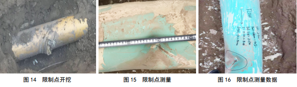 根據管道遺留存儲器數據讀取分析,里程存儲數據截止于A(yíng)點(diǎn)1號閥室外110 m處,與檢測器卡堵時(shí)A點(diǎn)壓力劇烈波動(dòng)點(diǎn)相吻合。開(kāi)挖后發(fā)現限制點(diǎn)凹陷(圖 14-16)。