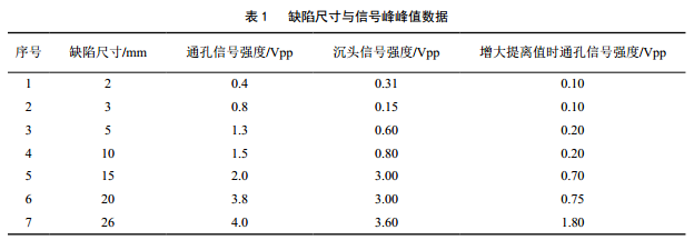 為 了 驗 證 永 磁 擾 動(dòng) 檢 測 方 法 的 可 行 性 , 從Φ 508 mm管道上切割下一段弧形板,在樣板上人為加工出不同尺寸的貫通孔和沉頭未貫通缺陷,用永磁擾動(dòng)探頭掃過(guò)這些缺陷,通過(guò)示波器獲取缺陷處的信號峰峰值電壓。統計不同缺陷類(lèi)型、尺寸以及提離值5 mm時(shí)信號峰峰值數據(表 1)。