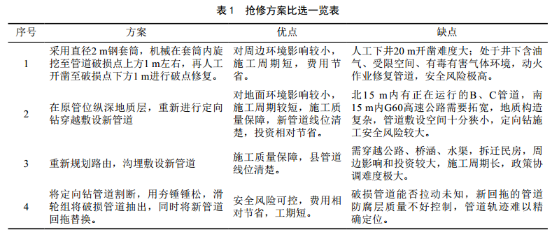 根據管道破損點(diǎn)周邊環(huán)境,初步確定四套搶修方案(表 1)。