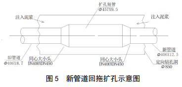 Φ 457×9.5 mm短管(圖 5)連著(zhù)舊管道一起回拖,同時(shí)給新管道引成了擴孔回拖空間。