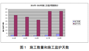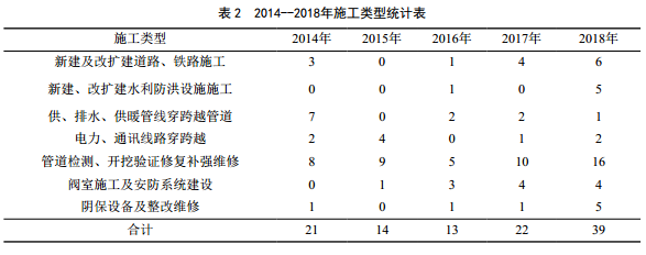 管道沿線(xiàn)施工類(lèi)型主要有公路、鐵路橋涵施工,供排水及暖通工程,管道異常焊縫開(kāi)挖檢測施 工 工 程 等 。 施 工 作 業(yè) 風(fēng) 險 識 別 、 施 工 類(lèi) 型 統計、施工數量和施工監護天數分別見(jiàn)表 1、表 2、圖 1。