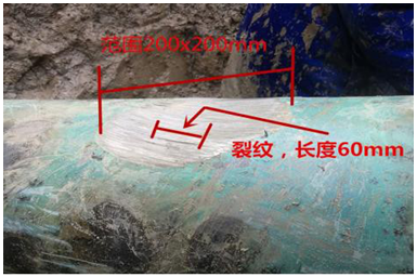 13日凌晨5時(shí),機械開(kāi)挖作業(yè)完成,搶修隊伍展開(kāi)人工掘土作業(yè);10時(shí)許,泄漏點(diǎn)作業(yè)面清理完畢,經(jīng)查損傷范圍200*200mm、管道壁原由7.0mm(實(shí)測)減少為最薄處2.9mm,出現60mm裂紋(泄漏點(diǎn));采用B型+2寸短接套筒整體焊接搶修措施(B型套筒設計壓力6.3MP、材質(zhì)L290、長(cháng)500mm),于當日15:30左右完成燃氣管線(xiàn)修復工作,遞級增壓至1.6MP,16:30恢復供氣。歷經(jīng)18小時(shí)搶險,未造成居民用氣停氣,未造成人員傷亡及次生衍生事故。