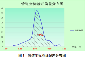 通過(guò)集成應用工程測量、智能檢測、航空攝影測量、地下管線(xiàn)探測、數據比對、坐標修正與轉換六項技術(shù),解決了在役管道難以獲取必要的基礎性數據問(wèn)題,獨創(chuàng )3S技術(shù)集成應用。運用該技術(shù)對某管道全線(xiàn)開(kāi)挖驗證105個(gè)點(diǎn),數據偏差全部在±0.86米以?xún),其中在?.5米之內的占92%(圖 1),實(shí)現管道大量基礎數據校準與更新,例如圖 2為一處管道路由修正前后對比圖,最終使管道中線(xiàn)坐標偏差控制在±1米以?xún)取?o:p>