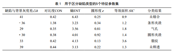 (5)數字化底片分析識別。依據NB/T 47013.2―2015標準,對數字化底片中存在的基礎信息進(jìn)行預處理,采用邊緣檢測與閾值分析的方法提取特征參數,提取的參數采用典型缺陷SVM多類(lèi)分類(lèi)器方法構造函數,對其中存在的焊縫缺陷進(jìn)行分析、識別。如裂紋、未焊透、未熔合、圓形夾渣、條形夾渣等缺陷,利用表 1所示的5個(gè)特征參數集劃分缺陷類(lèi)型,并對其可接受性進(jìn)行評價(jià)。