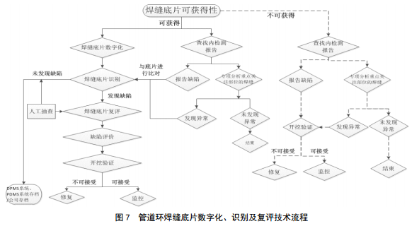 (2)焊縫底片數字化、識別及復評技術(shù)流程。根據焊縫射線(xiàn)底片可獲得性,可以找到管道焊縫射線(xiàn)底片的部分;無(wú)焊縫射線(xiàn)底片的部分。技術(shù)流程如圖 7所示,可篩選出需要重點(diǎn)關(guān)注的焊縫、建設期多余的底片以及無(wú)底片的焊縫。