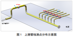 測點(diǎn)分布:根據上翹管線(xiàn)的初步受力分析,選擇3個(gè)危險點(diǎn)(A、 B、 C)作為測點(diǎn),如圖 1所示。