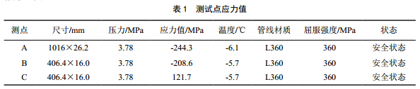 管線(xiàn)材質(zhì)為L(cháng)360鋼,屈服強度為360 MPa。研究表明壓應力引發(fā)疲勞裂紋或斷裂,其門(mén)檻值比拉應力高3~4倍[4]。所以測點(diǎn)A、 B、 C均處在安全狀態(tài)。