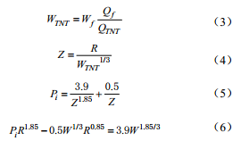 式中: WTNT ,天然氣爆炸事故的當量TNT質(zhì)量, kg; Wf ,參與爆炸的天然氣質(zhì)量,一般取泄漏天然氣質(zhì)量的10%, kg; Qf ,天然氣燃燒熱, J/kg;QTNT , TNT爆炸熱,一般為4.12~4.69 MJ/kg; z , 爆炸特征長(cháng)度; Pi ,爆炸超壓峰值。