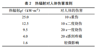 天然氣在開(kāi)始泄漏時(shí)與空氣混合并不完全,如果泄漏口附近有明火,將直接導致天然氣燃燒。燃燒主要危害來(lái)源于燃燒產(chǎn)生的熱輻射,熱輻射可致人體燒傷,使樹(shù)木或其他可燃物發(fā)生燃燒。熱輻射對人體的傷害準則如表 2所示。
