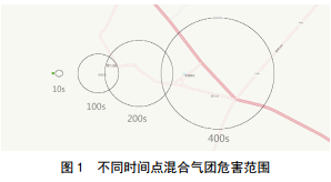 以10%天然氣濃度(窒息危險濃度)為濃度邊界,時(shí)間點(diǎn)分別取10 s、 100 s、 200 s、 400 s,運行天然氣管道事故后果分析工具箱中的高斯煙團模型,不同時(shí)間點(diǎn)混合氣團覆蓋區域如圖 1所示。