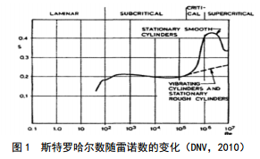式中: fs為漩渦泄放頻率, Hz; U為波流流速,m/s; D為管道外徑, m; St為斯特羅哈爾數(Strouhalnumber),是流體雷諾數Re的函數(圖 1),對于剛性圓柱體, St一般取0.2;流體雷諾數Re=U×D /v,其 中v為運動(dòng)黏度, m2/s。