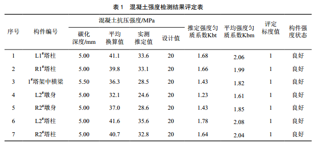 由混凝土強度檢測結果(表 1)可知,抽檢構件強度均滿(mǎn)足規范及設計要求,評定標度均為1,構件強度狀態(tài)良好。