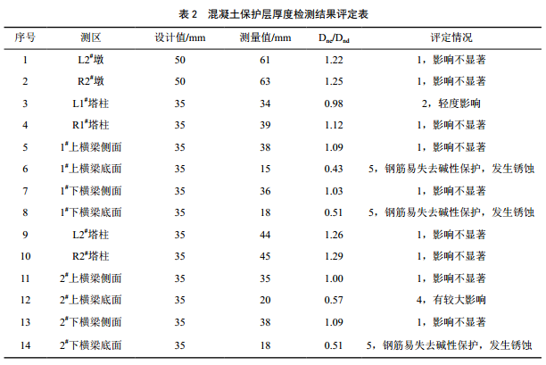 由鋼筋保護層評定檢測結果(表 2)可知,墩、塔柱、橫梁側面保護層厚度基本滿(mǎn)足設計要求,影響不顯著(zhù),橫梁底面保護層厚度普遍不足,保護層厚度 不足將影響結構耐久性,隨著(zhù)使用年限的增長(cháng),保護層厚度不足處將因鋼筋銹脹導致主梁出現裂縫,嚴重的發(fā)生混凝土剝落、露筋,銹蝕等病害。