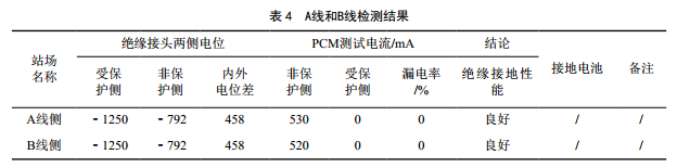 再采用PCM漏點(diǎn)檢測法和電位差法,檢測顯示 絕緣接頭性能良好,結果如表 4所示。