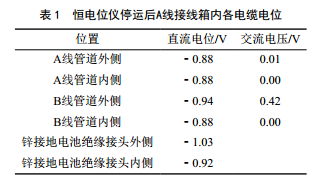 從恒電位儀運行前后, A線(xiàn)絕緣接頭內外側電位及恒電位儀運行參數初步判斷 A線(xiàn)管道跟油庫接地網(wǎng)存在電連接。