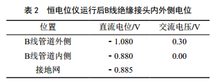 從恒電位儀運行前后, B線(xiàn)絕緣接頭內外側電位及恒電位儀運行參數判斷B線(xiàn)陰極保護系統正常。