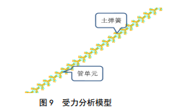 采用向量式有限元方法中的管單元和非線(xiàn)性土彈簧單元進(jìn)行管道受力分析,分析模型模擬在給定地表變形的情況下,管道與土體之間的相互作用,進(jìn)而確定管道在不同工況下的力學(xué)響應[3]。管道受力簡(jiǎn)化模型及受力分析模型如圖 9所示。有限元計算模型的坐標系以管道軸向為X軸,順氣流方向為正;以垂直管道軸向且豎直向上為z軸正方向;以垂直管道且水平指向坡外為y軸正方向。
