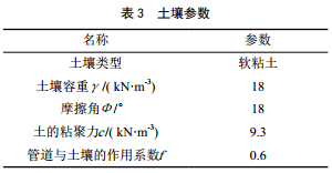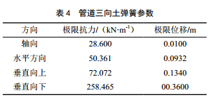 參考GB 50470―2008 《油氣輸送管道線(xiàn)路工程抗震技術(shù)規范》 [4]附錄E中關(guān)于土彈簧的規定,將管道與土體相互作用力用一系列離散非線(xiàn)性土彈簧進(jìn)行模擬。根據現場(chǎng)踏勘和管道建設期資料,管周土壤按軟粘土且相關(guān)土壤參數見(jiàn)表 3,管道三向土彈簧參數見(jiàn)表 4。