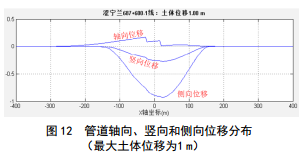 在土體蠕滑位移作用下,管道將發(fā)生軸向、側向和豎向位移,管道變形規律與土體位移規律近似,但隨管道受力特征而變。如圖 12所示為管道軸向、側向和垂向位移分布。在X<100 m區段內,軸向位移為正,說(shuō)明管道在土體位移作用下朝X軸正方向有軸向移動(dòng),進(jìn)而造成X<100 m區段內管道軸向受拉而X>100 m區段內管道軸向受壓。在土體位移作用下管道發(fā)生相應的側向和豎向位移,并造成彎曲應力。如圖 10所示,管道軸向彎曲應力不僅隨位移分布改變,而且與圖 7中管道走向相關(guān)。彎曲應力極值處對應于土體剪切作用較大處和管道走向改變處,因此在土體剪切帶和彎管處應重點(diǎn)關(guān)注管道彎曲變形情況。