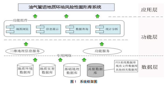 油氣管道地質(zhì)環(huán)境風(fēng)險性圖形庫系統采用B/S+C/S的體系結構,以穩定性和通用性為主導,進(jìn)行分層設計與開(kāi)發(fā)。為了實(shí)現平臺的開(kāi)放性、靈活性、可擴展性以及數據的可復用性,系統從邏輯上分為數據層、功能層和應用層[5]。如圖 1所示。
