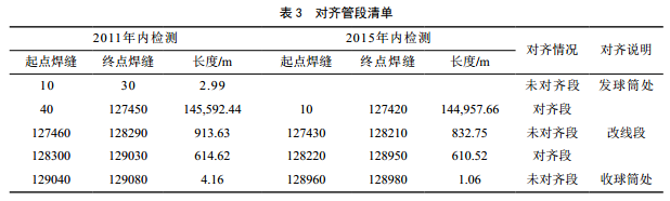 因兩次內檢測的起點(diǎn)和終點(diǎn)不同和改線(xiàn)管道,存 在未對齊管段,其他則可以對齊,即內檢測數據具備對齊條件,對齊可行。