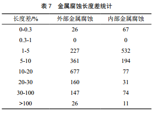 長(cháng)度發(fā)展趨勢: 2015年缺陷的內/外金屬腐蝕長(cháng)度普遍比2011年缺陷小,且存在降幅較大缺陷,只有少量缺陷的長(cháng)度為正增長(cháng)(圖 8、圖 9),長(cháng)度差統計如表 7所示。