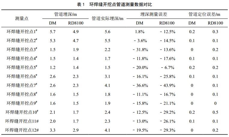選取12個(gè)環(huán)焊縫開(kāi)挖點(diǎn)位的測量數據用于比對分析(表 1), DM在測量管道埋深時(shí)整體誤差為﹣36.6%~1.8%(負值代表測量數值比實(shí)際深度小,下同)。其中10個(gè)點(diǎn)位(占樣本量的83.3%)的測量誤差為﹣20%~1.8%,測量誤差絕對值的平均值為12.5%;另外兩個(gè)點(diǎn)位(占樣本量的16.7%)受高壓線(xiàn)影響相對突出,深度測量誤差達到﹣ 31.8%和﹣36.6%。 RD8100在測量管道埋深時(shí)整體誤差為﹣43.9%~﹣6.7%,其中6個(gè)點(diǎn)位(占樣本量的50%)測量誤差絕對值超過(guò)了21%。所有樣本量的測量誤差絕對值的平均值為21.4%。由此可見(jiàn),管道定位RD 8100與DM都較準確,但RD 8100測量管道埋深可能會(huì )因為附近有高壓線(xiàn)或并行管線(xiàn)影響導致測量結果有較大偏差,而DM測量的結果就相對準確。