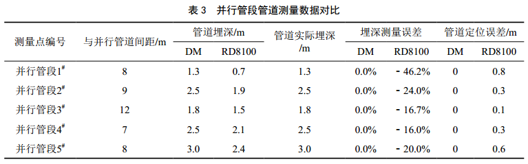 在管道并行區段選取5個(gè)點(diǎn)位的數據用于比對分析(表 3), DM在測量管道埋深和管道位置時(shí)誤差基本為零。 RD 8100在測量管道埋深時(shí)整體偏差達到﹣16%~﹣46.2%,其中1個(gè)點(diǎn)位(占樣本量的20%)測量誤差絕對值達到了46.2%,其他4個(gè)點(diǎn)位(占樣本量的80%)測量誤差為﹣16%~﹣24%, 80%樣本量的測量誤差絕對值的平均值為19.2%,整體誤差較大;在測量管道位置時(shí)偏差為0.1~0.8 m。由此可見(jiàn), RD 8100在測量時(shí)易受并行管段的影響,測量結果偏差較大,以往甚至發(fā)生過(guò)測量結果是其他并行管道的情況。 DM在測量時(shí)基本不受并行管道的影響,無(wú)論是管道位置還是埋深,與開(kāi)挖驗證數據基本一致。