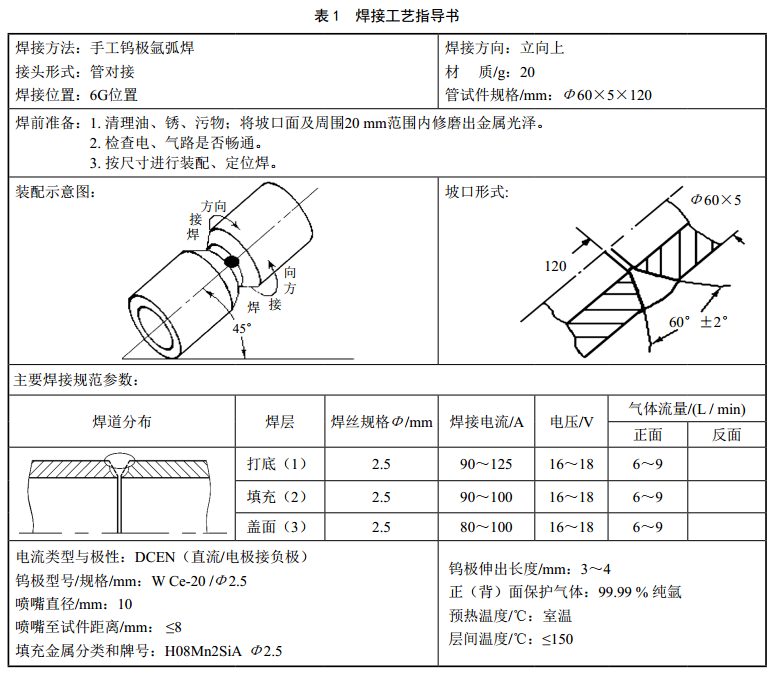 小直徑薄壁管對接6G位置手工鎢極氬弧焊焊接工藝指導書(shū)見(jiàn)表 1。