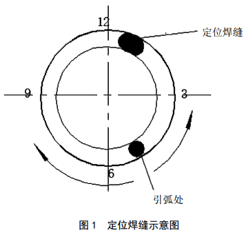 定位焊縫一處,分布在管圓周11點(diǎn)鐘或1點(diǎn)鐘方向,長(cháng)度<15 mm,間隙3.0~3.5 mm。必須按工藝要求焊接定位焊縫, 6點(diǎn)鐘、 12點(diǎn)鐘方向不允許有定位焊,保證質(zhì)量、兩端修磨(圖 1)。