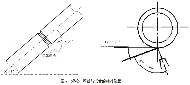 (3)焊槍、焊絲與試管的相對位置。鎢極與管體兩側分別成85°~90°;焊絲與管體切線(xiàn)方向成15°~20°,與鎢極成85°~90°,如圖 2所示。